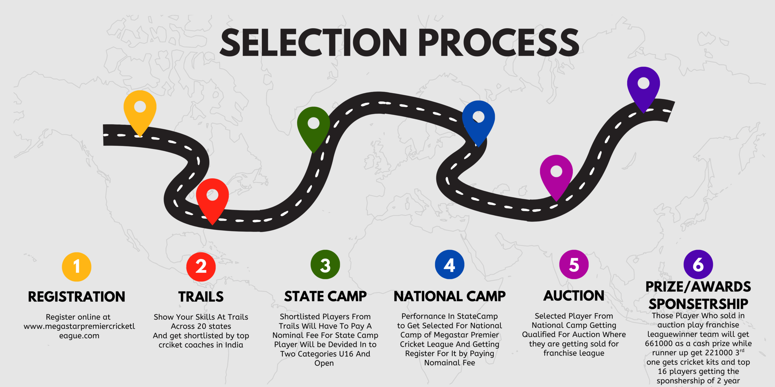 After the registration, the player will showcase his talent in the trial match. After getting selected the player is enrolled for Megastar Premier Cricket League (MPCL) with the additional fees of Rs. 6000. The League charges entitle him to play for the state level in Megastar Premier Cricket League. The state-level cricket league is their ticket to National level auctions.